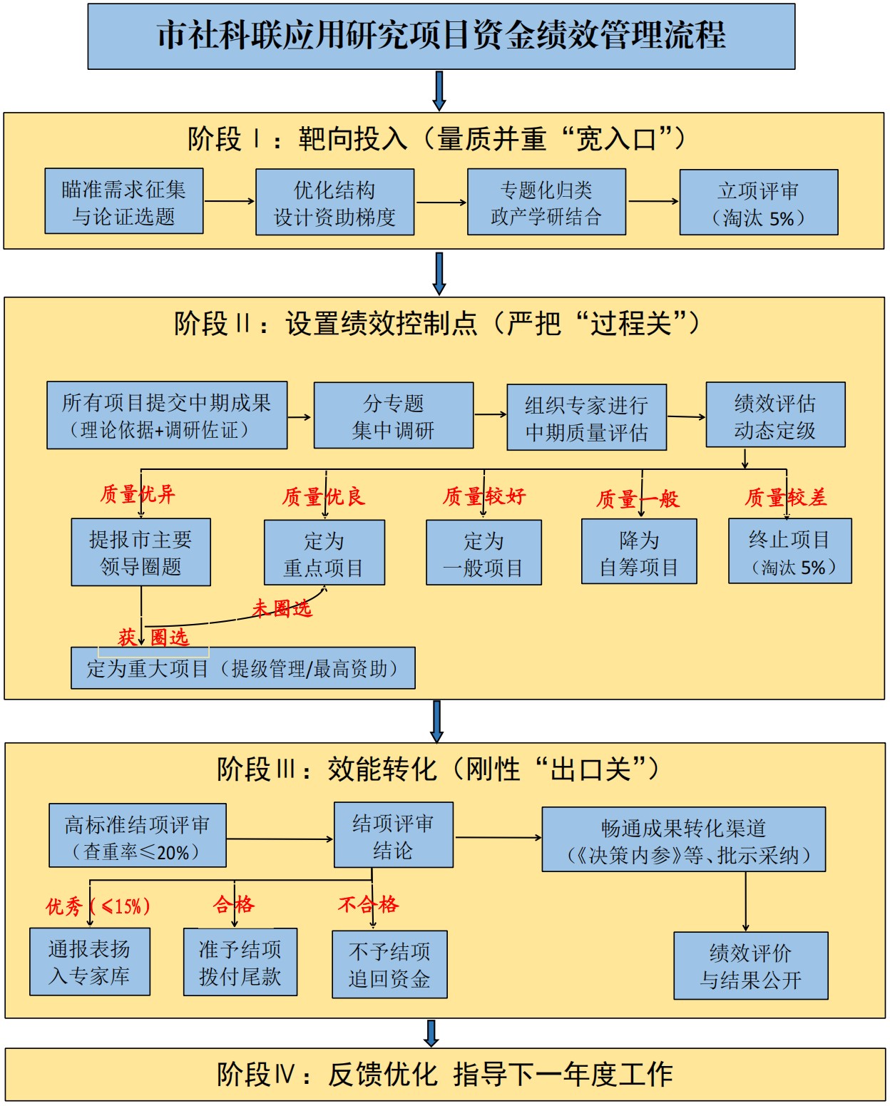 今年来,市社科联在组织年度社科应用研究项目过程中,深入贯彻“花钱必问效、无效必问责”的绩效理念,探索构建了贯穿项目申报、立项、执行、评估、结项全过程的资金绩效管理体系,显著提升了财政资金使用效益和社科研究成果服务地方发展的贡献度。一、严把“入口关”,确保资金投向精准资金绩效管理始于立项之前。市社科联通过精细化的项目设计和申报筛选,从源头上确保资金投向最需要、最可能产生实效的领域。1.聚焦中心,需求导向确定选题。项目选题紧密围绕市委市政府中心工作,特别是“中国式现代化连云港新实践样本大调研”和“实现八个新跨越寻理探源”两大核心活动,直接服务于“强富美高”现代化新港城建设需求。通过面向县区、机关、科研院所、学会、专家学者等广泛征集,上线全市哲学社会科学和软科学项目信息平台进行重复申报筛查把关,组织专家论证、领导审定,形成包括市社科应用选题、社科类社会组织选题、无锡连云港南北合作选题及优秀自拟选题在内的选题库,确保研究方向紧扣发展脉搏,避免“为研究而研究”,从源头上保障了资金投入的战略性和应用价值。2.优化结构,引导资源合理配置。项目设计区分不同类别和层次,明确资助导向。优先鼓励青年社科学者申报,为社科研究积蓄后备力量。同时,通过设置重大项目、重点项目、一般项目、自筹项目四种类别,并根据研究难度、预期价值和团队实力匹配差异化的资助标准(重大10000元、重点5000元、一般2000元、自筹无资助),引导有限资金向预期产出高、团队实力强的优质项目倾斜。3.团队优选,强化协同作战能力。明确要求项目申报必须以“课题组”形式进行,成员不少于3人,且必须按“政产学研用”模式组建,涵盖专家学者、机关人员、企业人员、实务工作者。这一强制性规定,打破了学术研究的“象牙塔”,从团队构成上确保了研究视角的多元性、实践基础的扎实性和成果转化的可行性,为项目最终产出高质量、可落地的应用成果奠定了坚实基础。严格的限项申报(负责人限1项,成员限2项)也有效防止了资源过度集中。二、强化“过程关”,实施动态绩效评估与调整改变以往“重立项、轻管理”的模式,市社科联创新实施“先立项、后定级”的动态管理模式,将中期评估作为资金绩效管理的核心枢纽,并采取“专题推进、组团调研”的形式组织课题组深入一线开展调查研究,夯实研究基础。1.“先立项后定级”,引入竞争与淘汰机制。项目申报后并非直接确定资助等级,而是先进行立项评审(淘汰约5%),获得“入场券”,初步筛选出具备基本研究能力的团队。真正的资金分配决策,则押后至中期评估环节。2.中期评估定等级,绩效导向精准资助。项目启动后约2个月,要求所有立项课题组提交3000字左右的决策咨询文稿及详实的调研佐证材料(资料清单、调研清单、理论依据等)。市社科联组织专家进行严格的中期质量评估,核心考察点包括:(1)调研深度与广度。是否按“深、实、细、准、效”要求开展实地调研,佐证材料是否充分;(2)问题分析精准度。现状分析是否实事求是、切中要害,论证是否有力;(3)对策建议雏形价值。 初步提出的建议是否具有针对性、可行性和创新性;(4)理论准备与资料时效性。理论支撑是否扎实,收集的数据资料是否真实、有效、具有时效性。根据评估结果,将项目动态调整为五类:(1)重大项目候选(≤30项):中期成果质量优异者。其中最优者提请市委市政府主要领导“圈题”,获圈题者正式定为“重大项目”(≤10项,2025年书记、市长各圈定5项),享受最高资助及提级管理(协商纳入市社科基金重点项目)。未获圈题者降为重点项目。(2)重点项目(≤30项):质量优良者。(3)一般项目(≤70项):质量较好者。(4)自筹经费项目(≥100项):质量一般者。(5)终止项目(≥5%):质量较差者,停止资助,项目终止。此机制将资金资助额度与研究过程质量和阶段性产出直接、刚性挂钩,实现了“干得好才能拿得多,干得差可能被淘汰”,极大激励了课题组做实调研、早出高质量成果,有效避免了资金沉淀和低效使用。3.强化调研过程管理,夯实绩效基础。明确要求各课题组必须高度重视调研质量和成效,强调实地调研与资料收集相结合,确保数据真实性和时效性。探索“分层次、分专题、分阶段”推进,市社科联筛选重点课题候选项目57项进行重点跟踪管理;区分对待“无锡连云港南北合作”“党建引领基层治理”“优化营商环境”“‘一带一路’与开放发展”“青年社科学者”五类专题,逐一制定个性化分阶段推进举措,集中开展调研,共享研究资料。要求课题组建立工作台账,留存调研过程证据;通过建立项目工作QQ群,鼓励课题组提前通报调研安排、协调集体调研,既加强了交流,也减轻了基层负担,提高了调研效率,为产出高质量成果提供了坚实的过程保障。三、硬化“出口关”,突出成果转化与激励约束项目结项是检验资金使用最终效益的“试金石”。市社科联通过严格的结项评审和鲜明的激励约束机制,确保资金投入产生实实在在的应用价值。1.高标准结项评审,严控成果质量。一是质量核心要求。强调问题分析要“实事求是、论证有力”,对策建议要具备“针对性、可行性和创新性”,并对报告中所涉数据的严肃性、真实性负责。二是学术规范硬约束。突出强制要